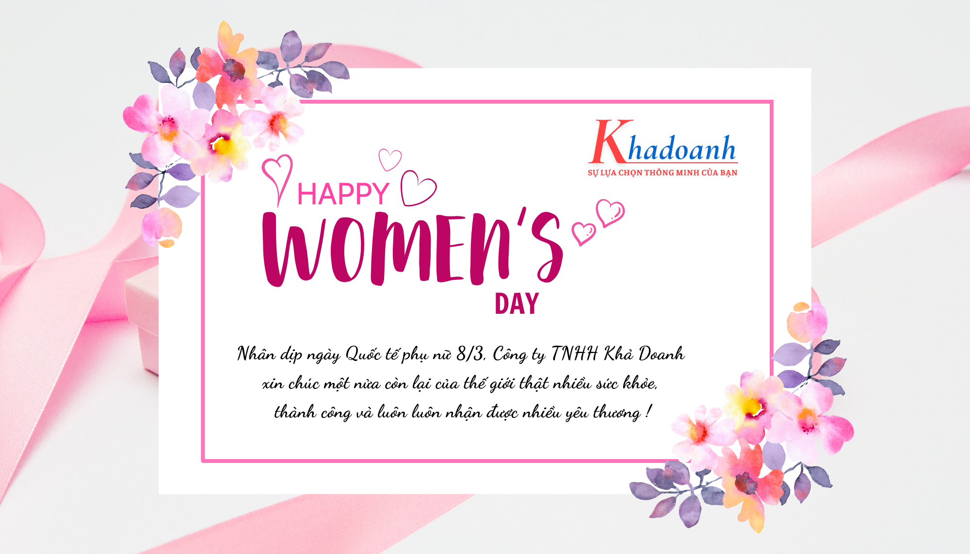 Nhân dịp này, Công ty TNHH Khả Doanh cũng xin gửi lời chúc đến Quý khách hàng, Quý đối tác nói riêng và một nửa còn lại của thế giới nói chung thật nhiều sức khỏe, thành công và luôn luôn nhận được nhiều yêu thương !