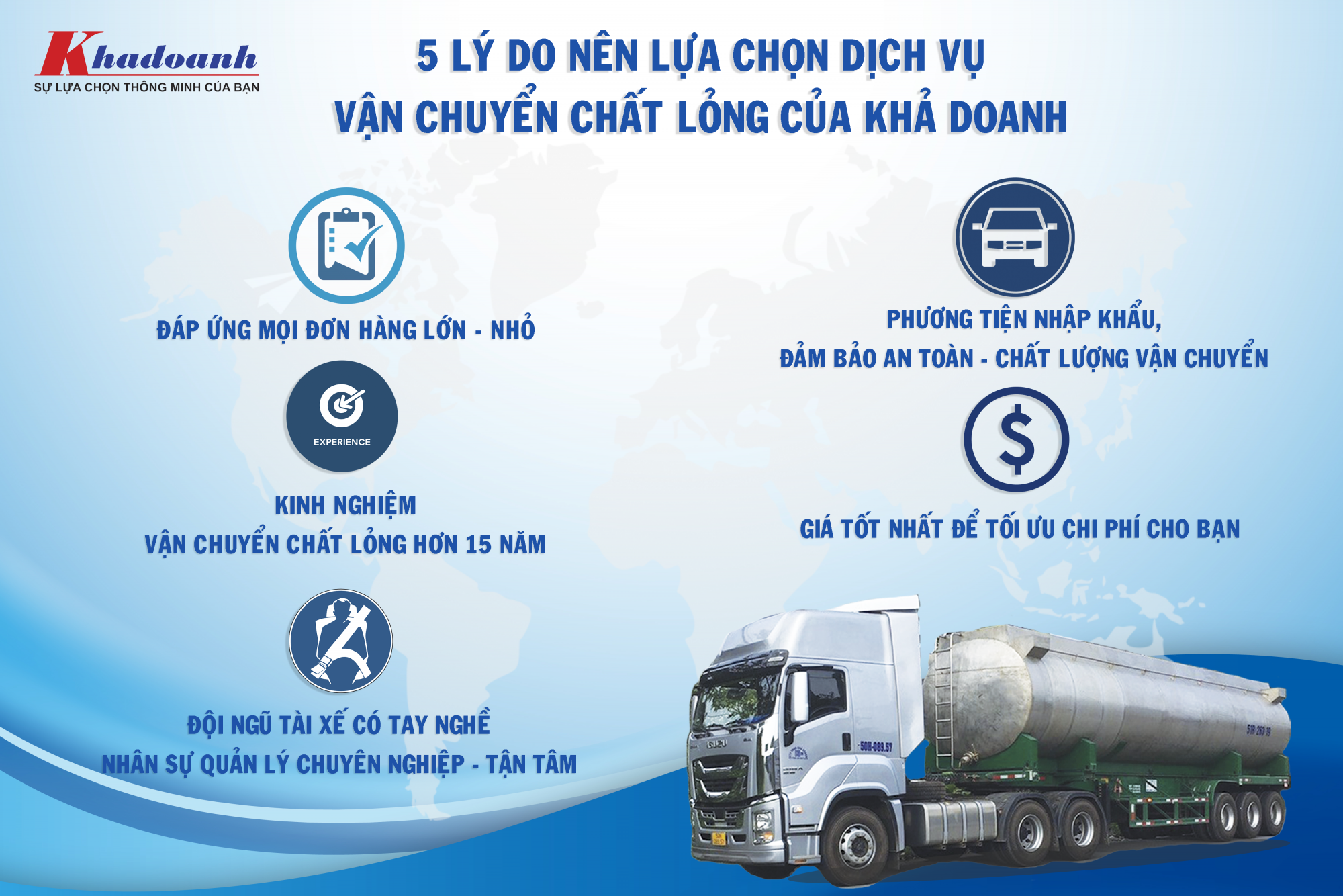Dưới đây là 5 lý do để Khả Doanh chúng tôi tự tin sẽ làm hài lòng khách hàng khi sử dụng dịch vụ vận chuyển chất lỏng tại công ty:
