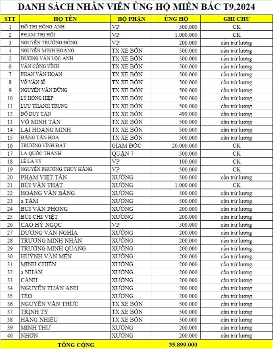 Với truyền thống “lá lành đùm lá rách”, đau thương, hoạn nạn bao bọc lấy nhau, ngày 13/09, Công ty TNHH Khả Doanh đã phát động chương trình “CHUNG TAY HƯỚNG VỀ MIỀN BẮC” với sự tham gia của toàn thề các cán bộ nhân viên trong công ty nhằm góp chút phần nào đó để mong đồng bào bị ảnh hưởng nặng nề của bão, lũ sớm vượt qua nỗi đau, ổn định cuộc sống.