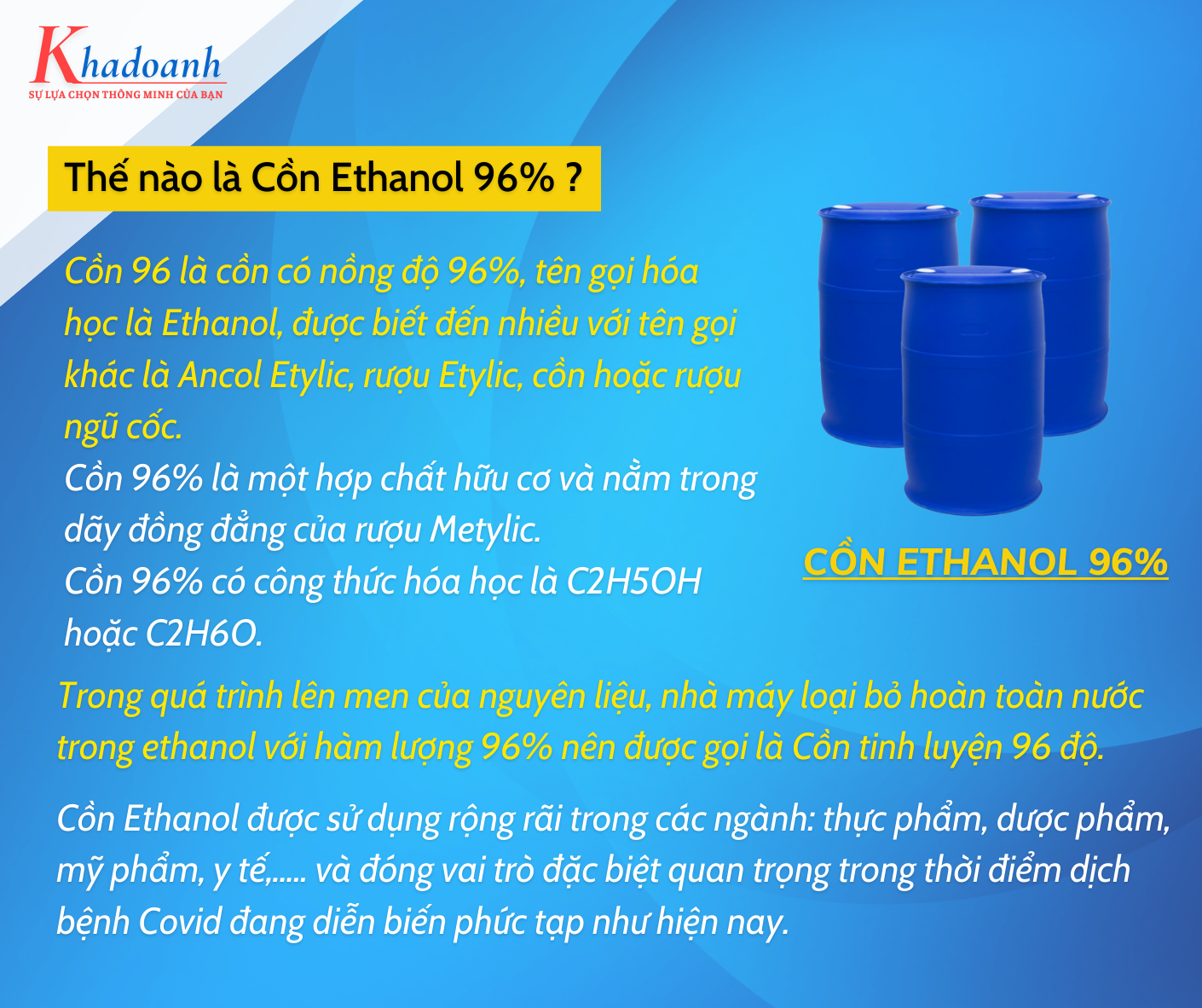 Cồn 96 là cồn có nồng độ 96%, tên gọi hóa học là Ethanol, được biết đến nhiều với tên gọi khác là Ancol Etylic, rượu Etylic, cồn hoặc rượu ngũ cốc.