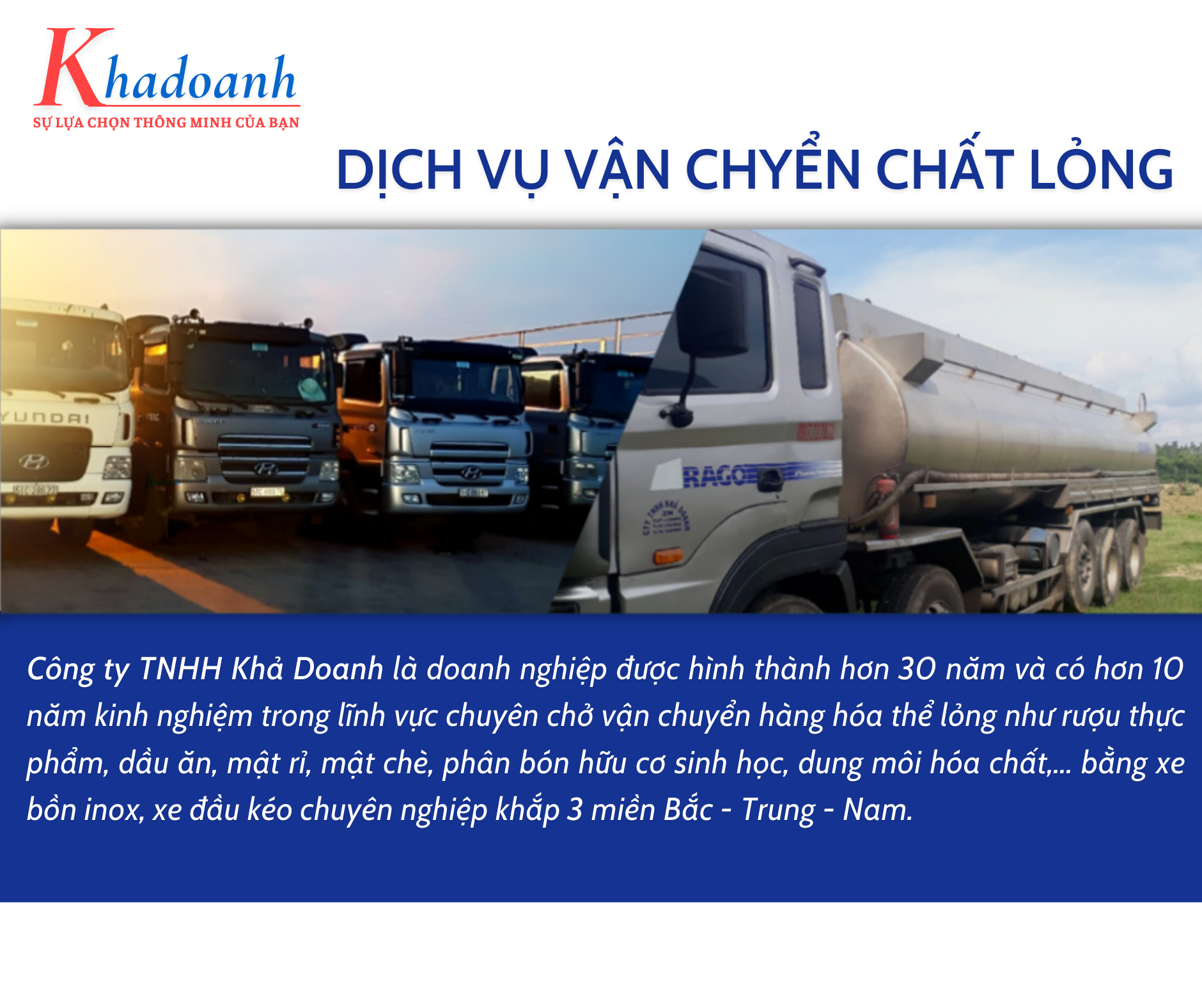CÔNG TY TNHH KHẢ DOANH là doanh nghiệp được hình thành hơn 30 năm, và có hơn 10 năm kinh nghiệm trong lĩnh vực chuyên chở vận chuyển hàng hóa thể lỏng như rượu thực phẩm, dầu ăn, mật rỉ, mật chè, phân bón hữu cơ sinh học, dung môi hóa chất,... bằng xe bồn inox, xe đầu kéo chuyên nghiệp khắp 3 miền Bắc - Trung - Nam.
