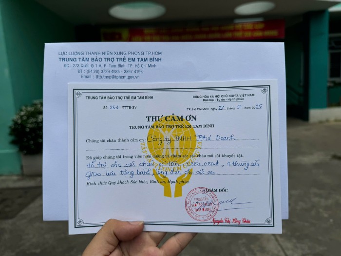 Ngày 27/09/2025 – một ngày Trung Thu thật khác. Không đèn lồng phố thị rực rỡ, không mâm cỗ đầy đủ bên gia đình, nhưng tại Trung tâm nuôi dưỡng và bảo trợ trẻ em Tam Bình (TP.HCM), tập thể Công ty TNHH Khả Doanh đã cùng nhau mang một cái Tết Trung Thu thật ấm áp đến với những mảnh đời còn nhiều thiếu thốn. Mỗi phần quà không chỉ là bánh kẹo, sữa hay đồ chơi... mà còn là những món quà của tình yêu thương, sự quan tâm và niềm tin.