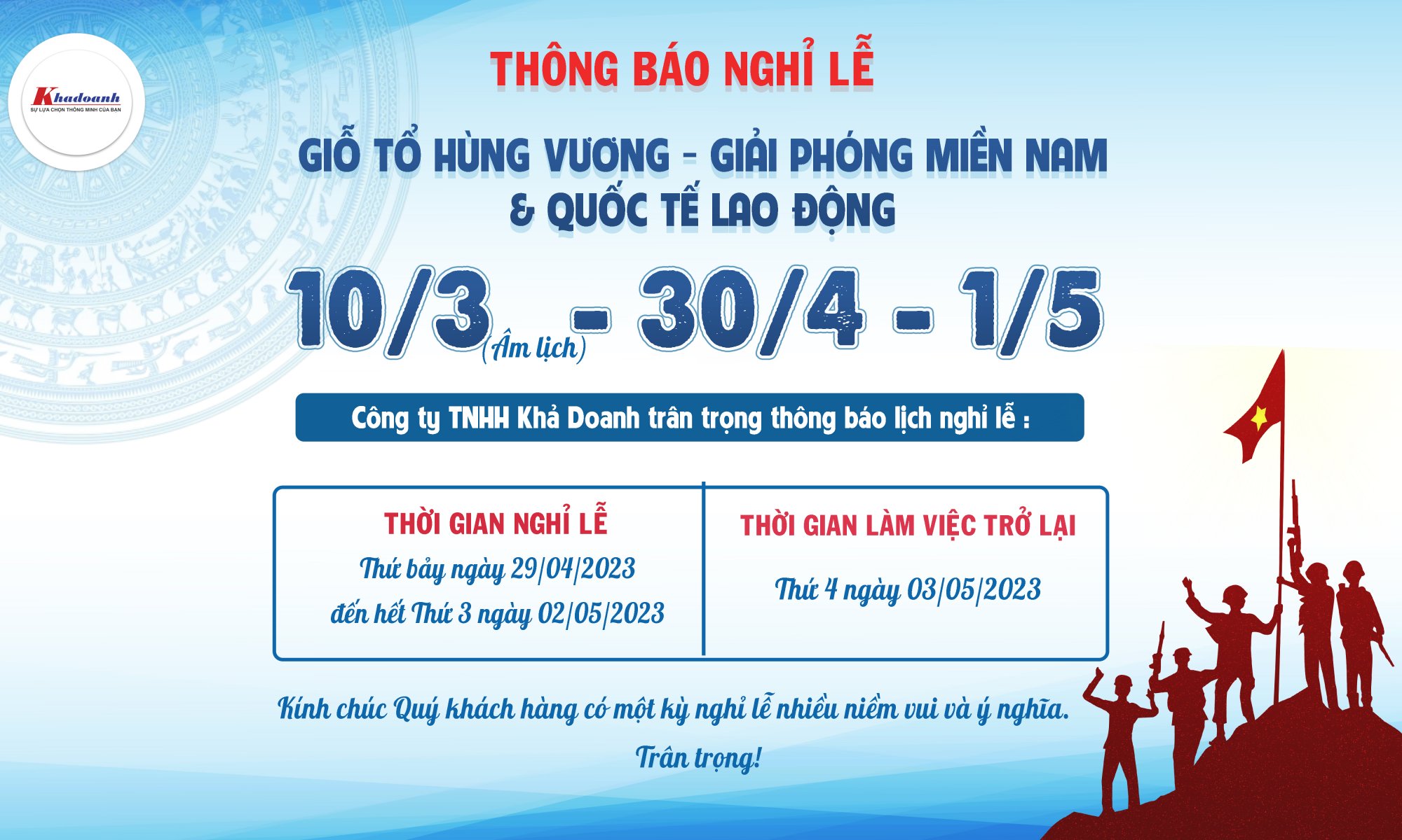 Công ty TNHH Khả Doanh trân trọng thông báo thời gian nghỉ lễ: Giỗ Tổ Hùng Vương 10/3 âm lịch, Giải Phóng Miền Nam 30/4 và Quốc Tế Lao Động 1/5 năm 2023